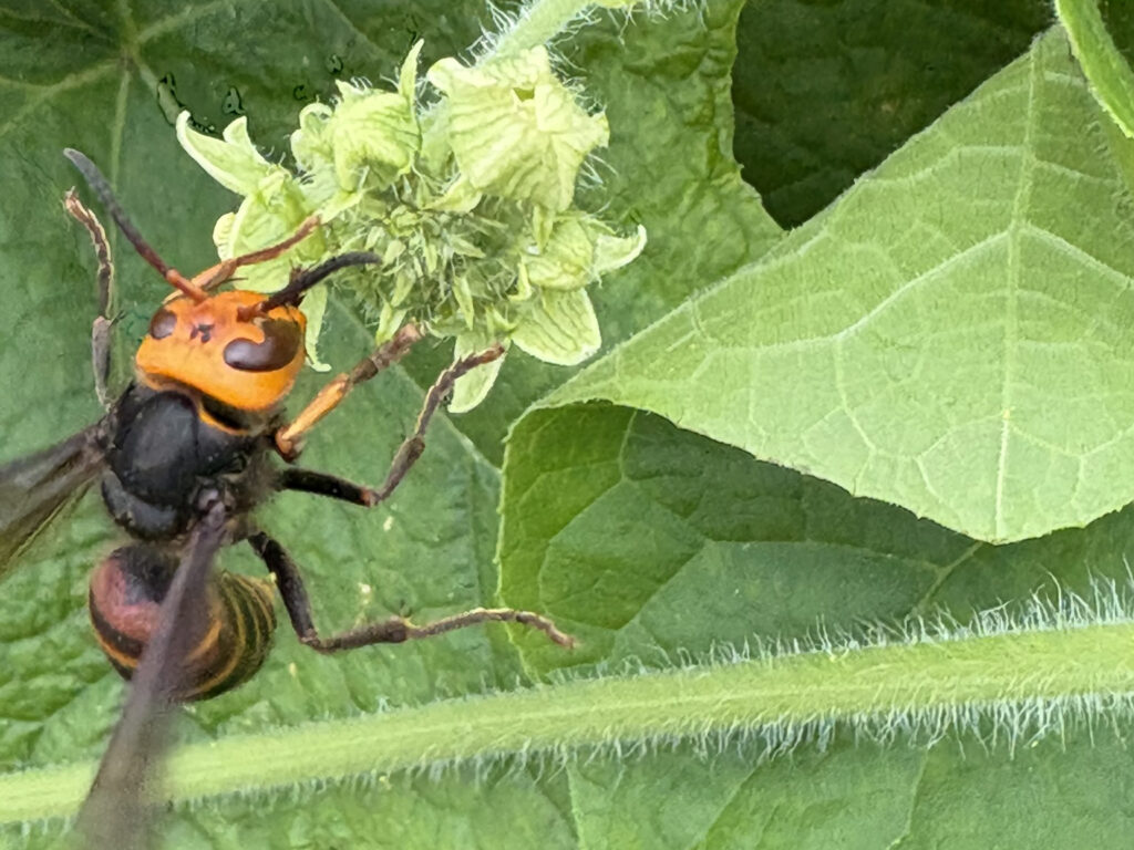 私のスマホは望遠がないので、ぎりぎりまで接写する。コガタスズメバチはおとなしい性格といわれているので、すぐには攻撃してこないだろうと思い撮影することにした。