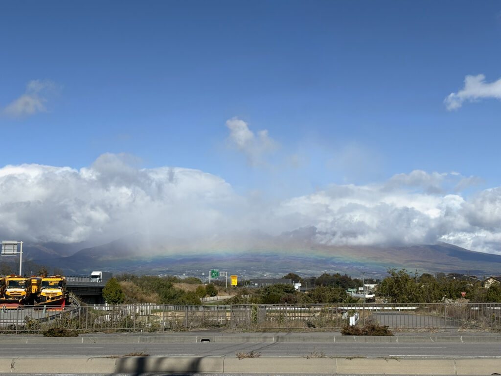運転中に見えたのが、浅間山に低くかかる虹だった。