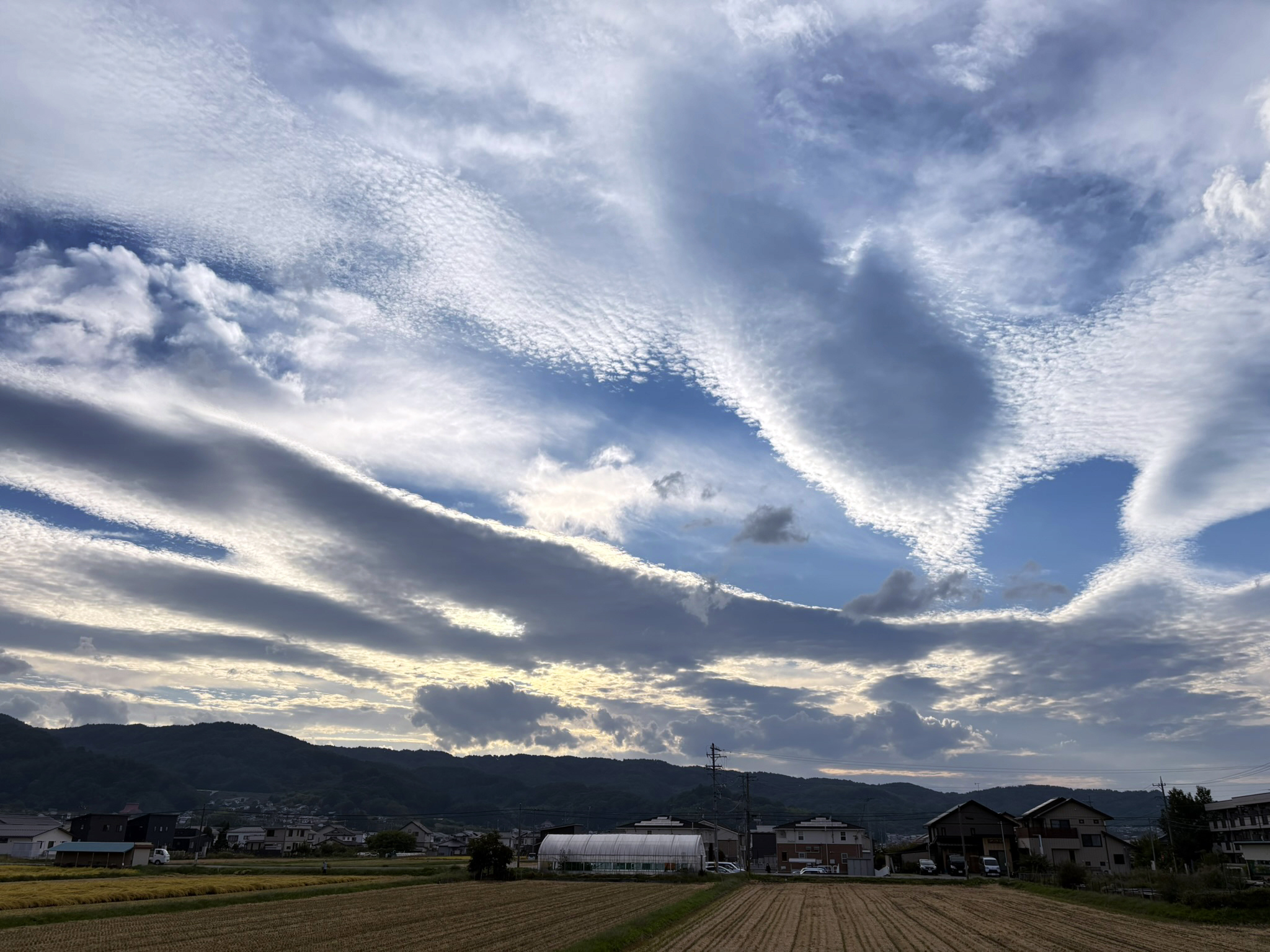 夕方の西の空には、うろこ雲(?)レンズ雲(?)とも分からない雲が出ていた。 詳しい人だったら、これは…