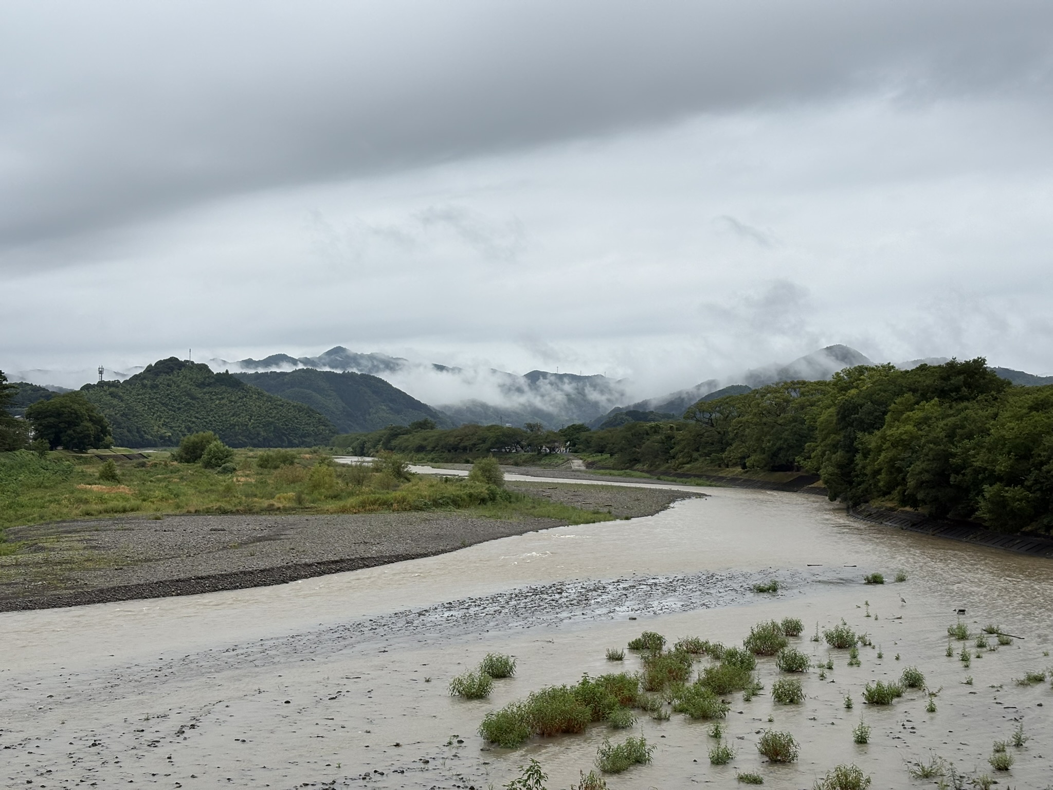 雨上がりの朝。 夏の朝の湿った空気の中、家から出て川沿いを歩く。橋の上から見た景色は、雨雲が山に取り…