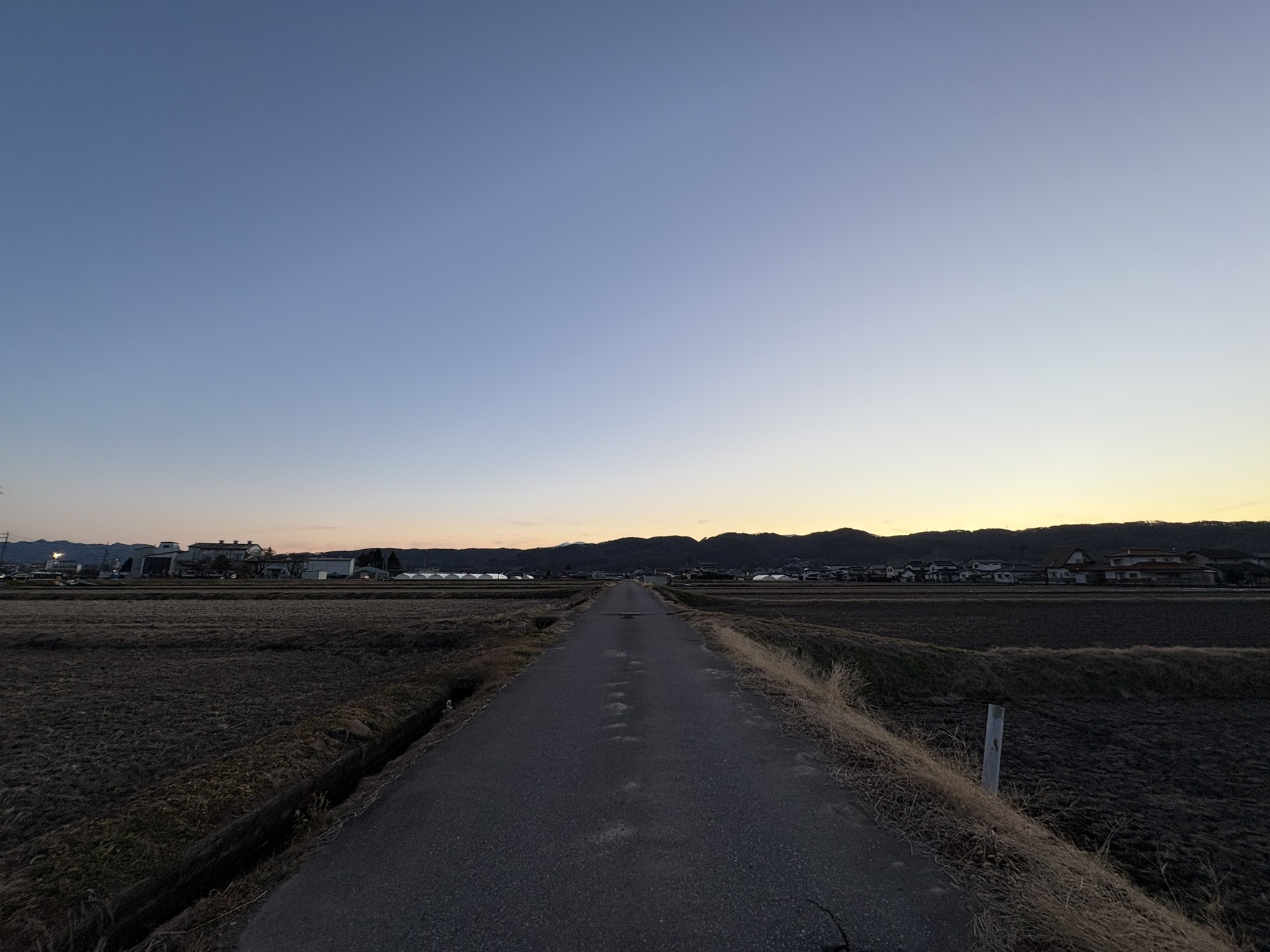 時刻は16時40分山の稜線に太陽が沈んでから30分、水平線上に太陽が沈んでから10分。 真っすぐ南を向いた田…